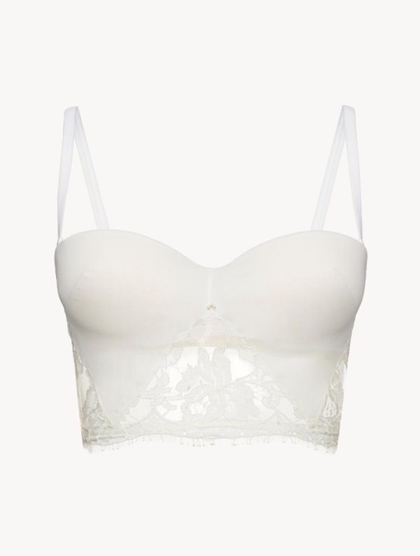 Discover the Per Sempre collection, featuring exquisite pieces crafted from premium upcycled materials, transformed into timeless silhouettes designed to become cherished wardrobe essentials. This Off White Bandeau Bra combines delicate, ethereal details with a smooth, flawless fit and exceptional comfort. Expertly constructed from cotton Leavers lace, it features supportive underwire padding, convertible removable straps, and elegant Swarovski pearl accents that symbolize pure love and prosperity. Complete your luxurious ensemble with the matching Brazilian Briefs, Thong, or Short Robe.
