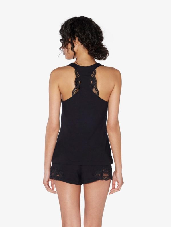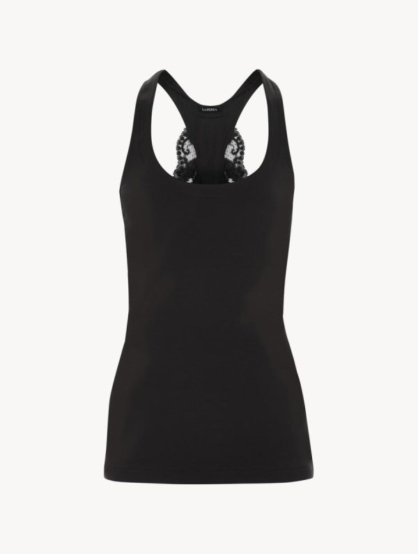 Experience ultimate sophistication with this stretch cotton jersey vest top, featuring a luxuriously substantial feel that drapes beautifully. Designed for versatile styling, this elegant undergarment offers exceptional comfort with its premium construction. The back showcases exquisite floral stretch Leavers lace detailing for a touch of romantic elegance.