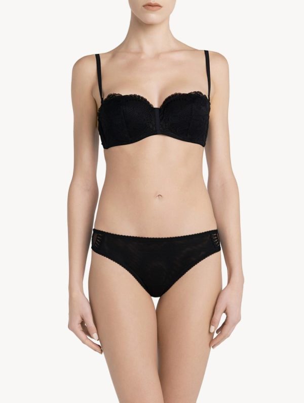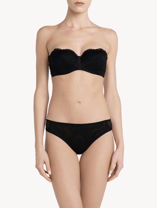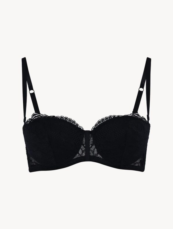 Experience exceptional elegance with this stretch Leavers lace bandeau bra, expertly designed for low necklines and featuring underwire construction with softly padded cups that deliver superior lift and comfortable support.