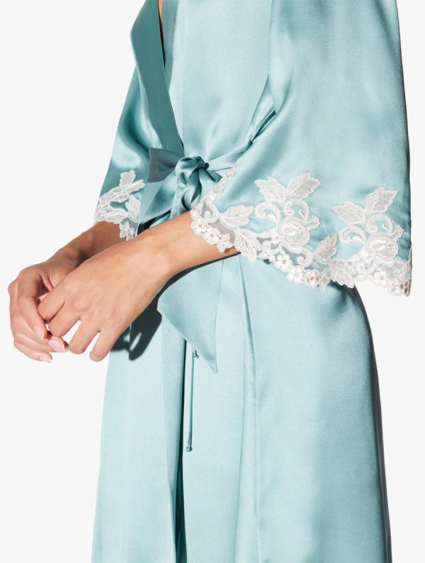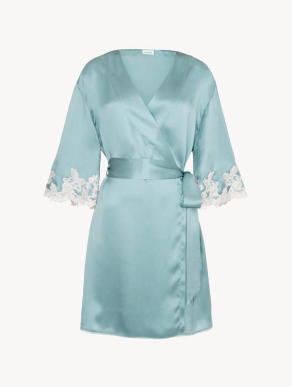 La Perla Maison captures the true spirit of its Made in Italy heritage. Defined by an antique Florentine technique of applying embroidery by hand, this unique piece can take up to two days to create. Crafted from a weightless almond green coloured silk-satin, the Maison robe embodies qualities of preciousness and individuality. The elegant crossover silhouette is trimmed with handcrafted frastaglio embroidery to the sleeves. A sash tie at the waist creates a sensual definition. Pair with the matching slip for a timeless look.