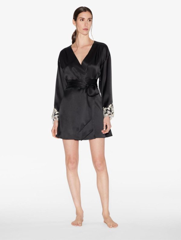 La Perla Maison captures the true spirit of its Made in Italy heritage. Defined by an antique Florentine technique of applying embroidery by hand, this unique piece can take up to two days to create. Crafted from a weightless black silk-satin, the Maison robe embodies qualities of preciousness and individuality. The elegant crossover silhouette is trimmed with handcrafted ivory frastaglio embroidery to the sleeves. A sash tie at the waist creates a sensual definition. Pair with the matching slip for a timeless look.