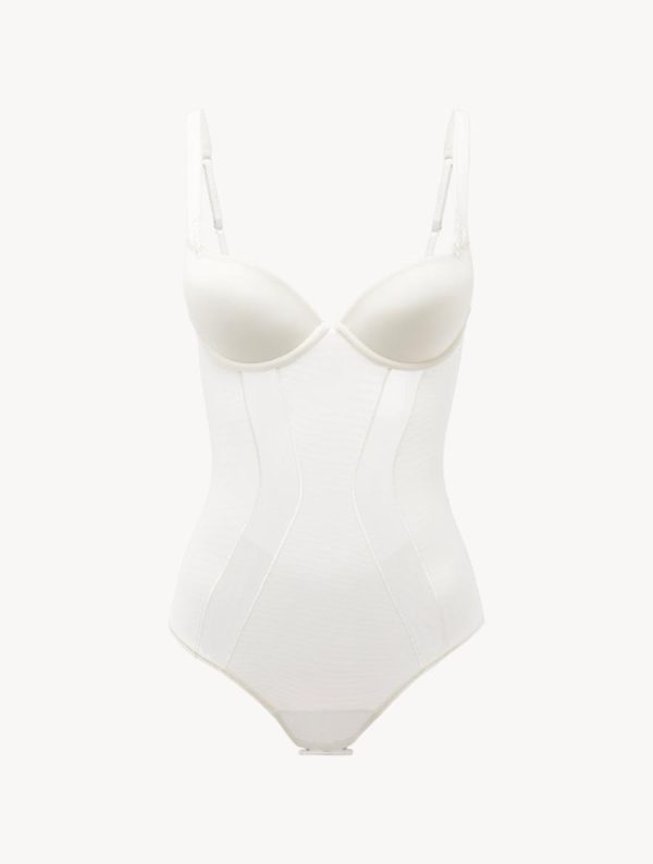 Women Luxury Lycra Bodysuit In Beige With Embroidered Tulle | La Perla Bodysuits & Bustiers