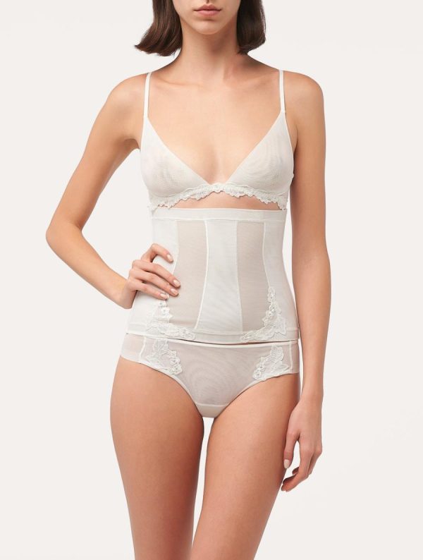 The Maison Contouring collection offers an irresistibly comfortable alternative to restrictive shapewear. Crafted from soft stretch tulle, this underbust corset creates a sculpted, smooth silhouette that cinches the waist while ensuring all-day comfort. Pieced with panels of sheer tulle, it is detailed with embroidery taken from the iconic Maison collection.