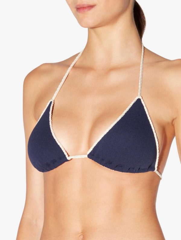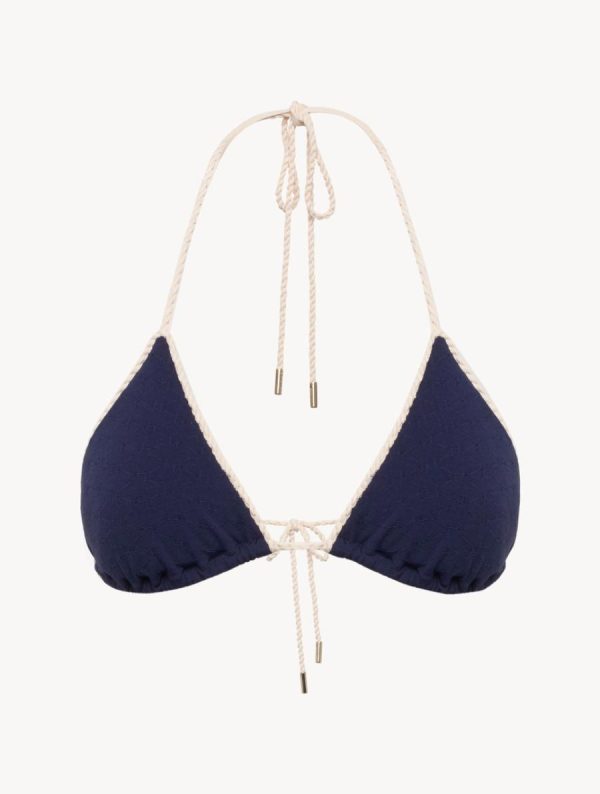 Blending elegant sophistication with a modern nautical spirit, the La Perla Signature Triangle Bikini Top in blue is elevated with the iconic LP monogram in a tonal, stretch jacquard. Cut to a chic, contemporary silhouette with removable padding for soft support, it’s finished with contrasting cordonette detailing for timeless resort style. Complete the look with the co-ordinating Briefs.