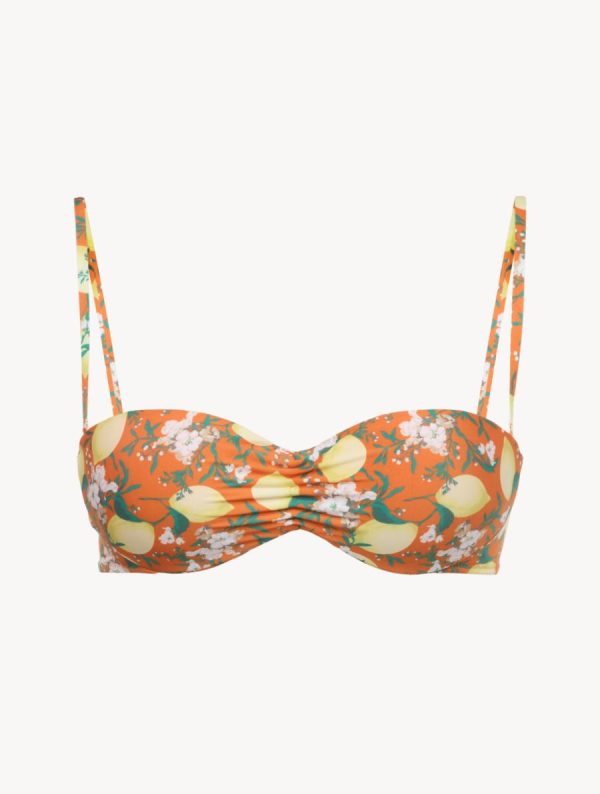 Capturing the irresistible mood of an Italian summer, the Amalfi Twist Bandeau Bikini Top in orange features a fresh and vibrant print of lemons and flowers. Cut to a timeless and flattering silhouette, it’s underwired and padded for soft support with removable straps, and finished with subtle pleat detailing. Complete the look with the co-ordinating Short or Long Dress for flawless holiday style.