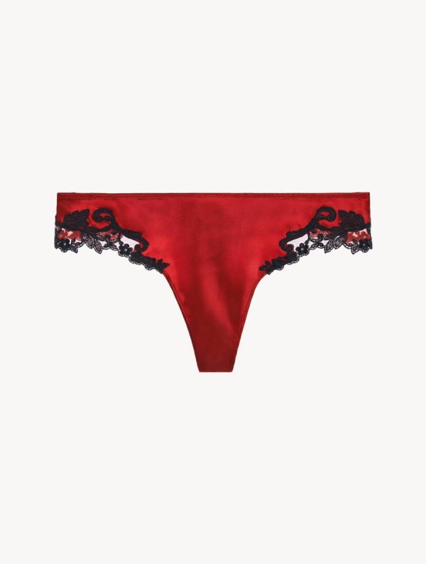 The most luxurious piece in the La Perla Maison collection features embroidered motifs on a tulle background in the same colour as the silk, hand finished with a double-frastaglio technique. Silk satin g-string embellished with embroidery on tulle backing in the same colour silk. Finished with hand-embroidered double frastaglio embroidery. This process reproduces the effect of flowers climbing up the body. A modern yet elegant creation that represents the newest and most exquisite style in the La Perla Maison collection.