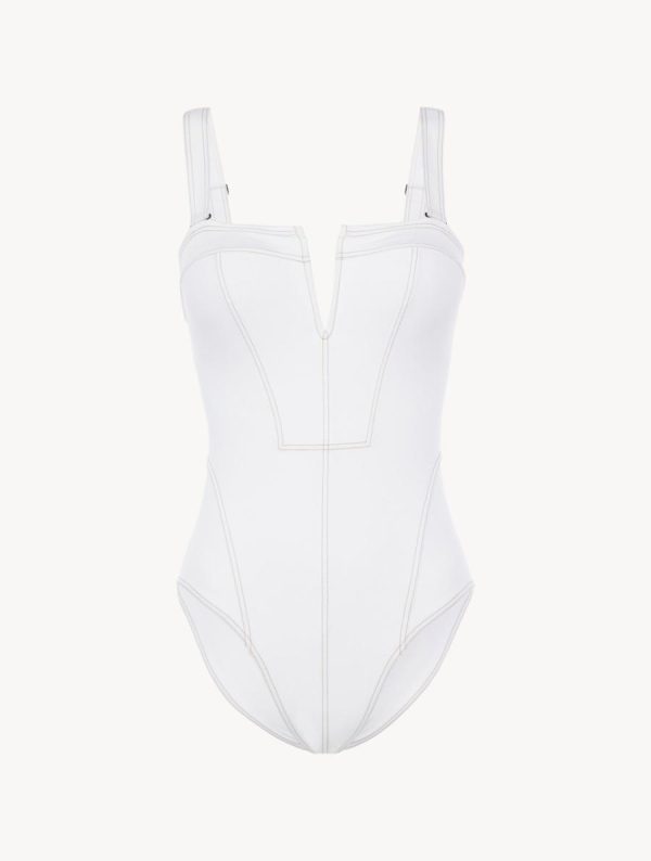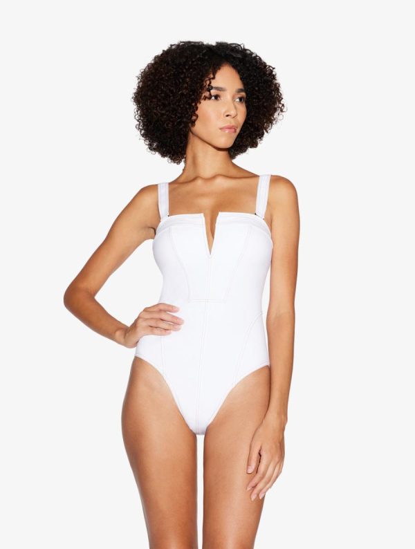 Combining flawless, sophisticated silhouettes with sports-inspired details, the When Summer Comes collection is designed to offer luxurious comfort and make you look and feel incredible whether you’re on the beach or by the pool. Crafted from exquisite stretch Lycra and with an ultra-flattering shape, the Swimsuit in White is wireless with removable padding and finished with a notched neckline, contoured,contrasting stitching and bi-color adjustable straps.