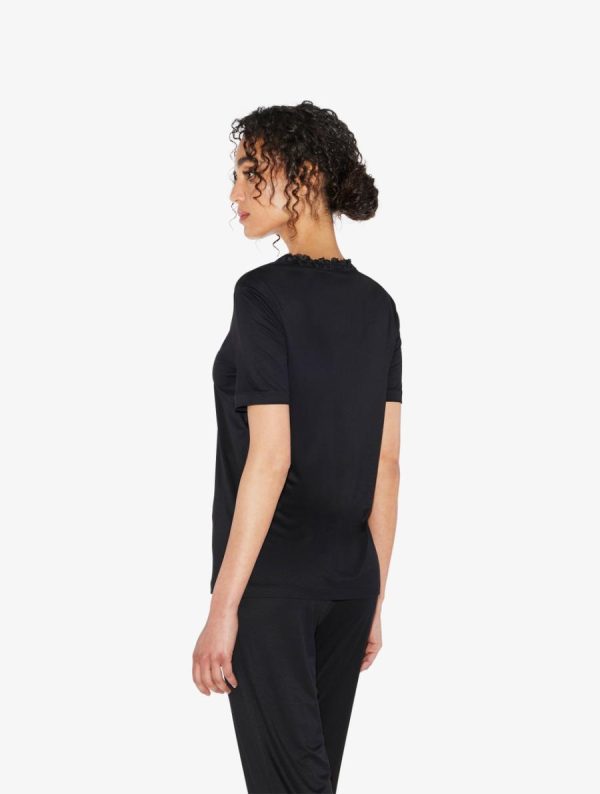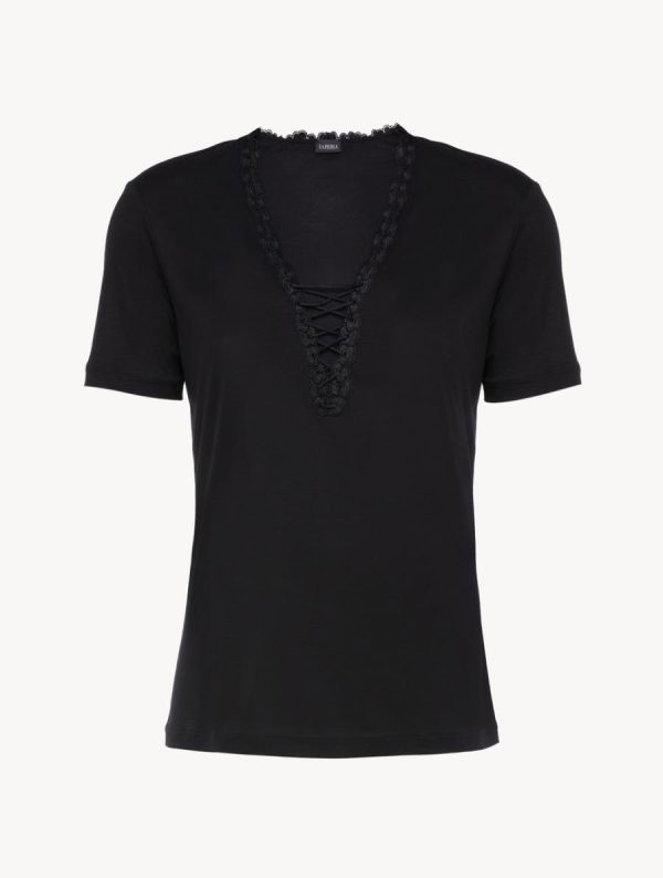 The Zephyr collection highlights La Perla’s heritage of fine craftsmanship, translating this with a youthful twist. Rich floral embroidery and sheer panels add precious accents to sumptuously soft modal stretch. This classic pyjama t-shirt is made sensual with a plunging neckline trimmed with embroidered tulle and silk satin corsetry-inspired lacing. Pair with matching trousers for a comfortable, elegant take on nightwear.