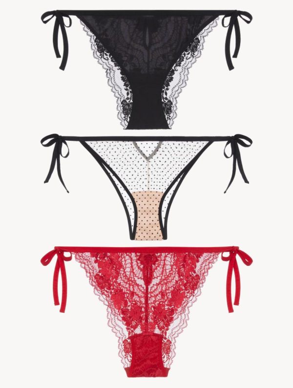 A trio of our most-loved side-tie briefs. All cut to a universally flattering Brazilian silhouette, the set includes a pair in sheer polka-dots with keyhole detailing at the back; a bold red pair in exquisite lace; and a timeless black pair with lace detailing at the back.Elevated underpinnings to your favorite ready-to-wear looks.