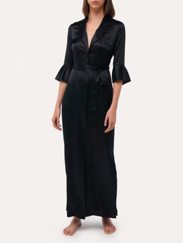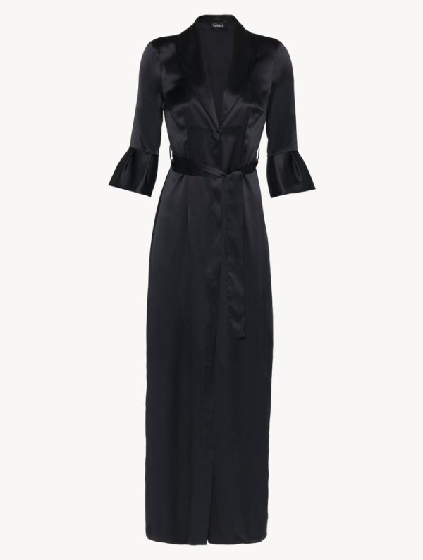 Experience ultimate luxury with this exquisite silk-satin robe featuring sophisticated feminine details including a timeless shawl collar and gracefully flared sleeves. Designed to enhance your natural silhouette, it creates a flattering slim-fit look with a waist-defining sash belt that ties perfectly. Perfect for layering over matching lingerie or your favorite nightwear ensemble.